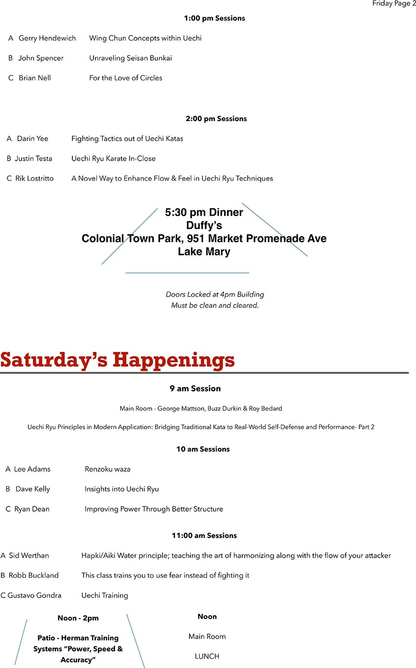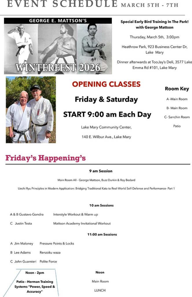 WinterFest George E. Mattson 2026 WinterFest Complete Event Schedule by Cecilia Salbuchi February 25, 2026 February 25, 2026 0 comment 0 FacebookTwitterPinterestEmail Cecilia Salbuchi Uechi Ryu Karate IUKF Argentina Website Technical Support for Uechi-ryu.com previous post Three Okinawan Words Related Articles Get ready for WinterFest 2026 August 29, 2025 George E. Mattson 2025 WinterFest Complete Event Schedule February 17, 2025 George Mattson’s 2023 WinterFest Symposium November 14, 2022 2020 Winterfest! December 28, 2019 2020 Winterest review March 12, 2019 2019 Winterfest Schedule February 5, 2019 Time for us all to Winterfest!! January 17, 2016 Sign up today for WinterFest February 3, 2015 WinterFest 2015 – March 6th and 7th! February 18, 2014 WinterFest News!!! February 14, 2012 Leave a Comment Cancel ReplyYou must be logged in to post a comment.